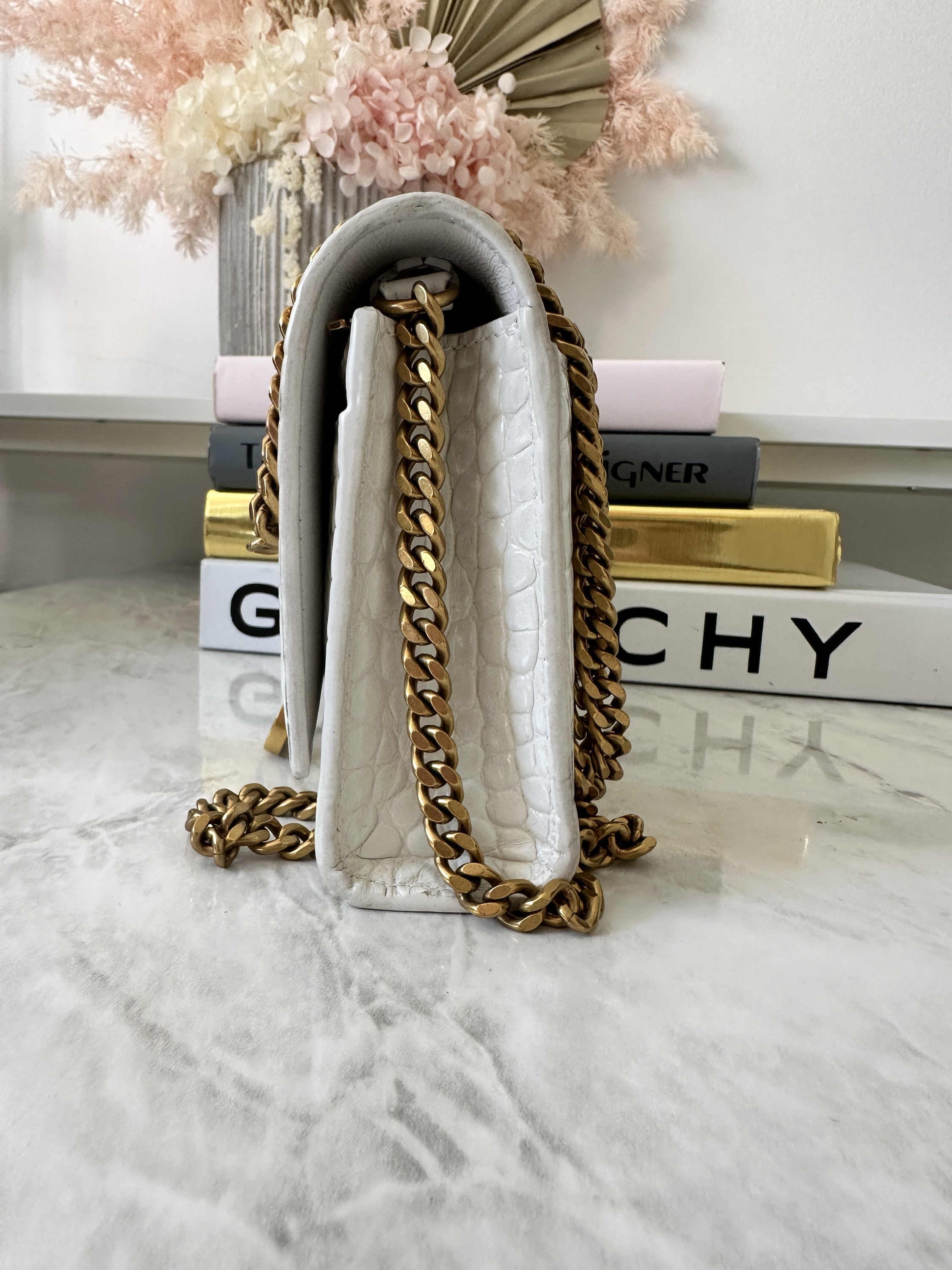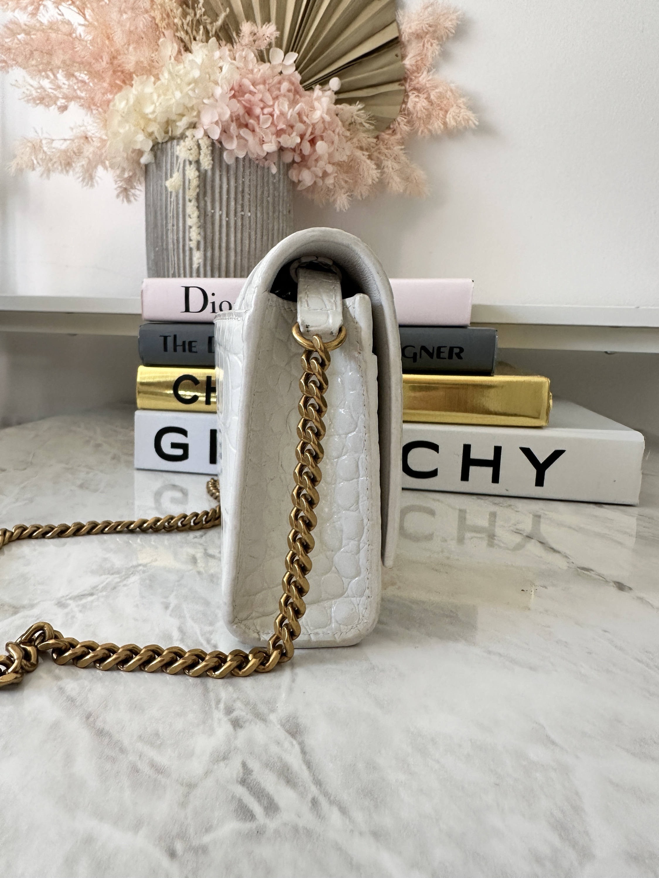 Hourglass crocodile embossed chain wallet with gold hardware